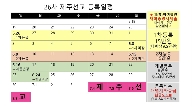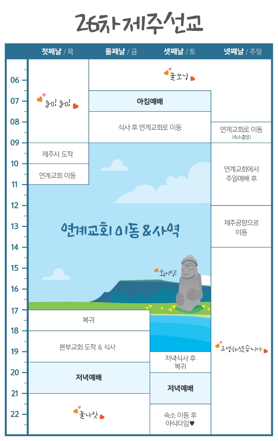 | ■ 제주선교 7월 4-7일 목금토일. 진별로 평균 5개 정도 교회가 연계되어 진행됩니다. 많은 기도바랍니다. |