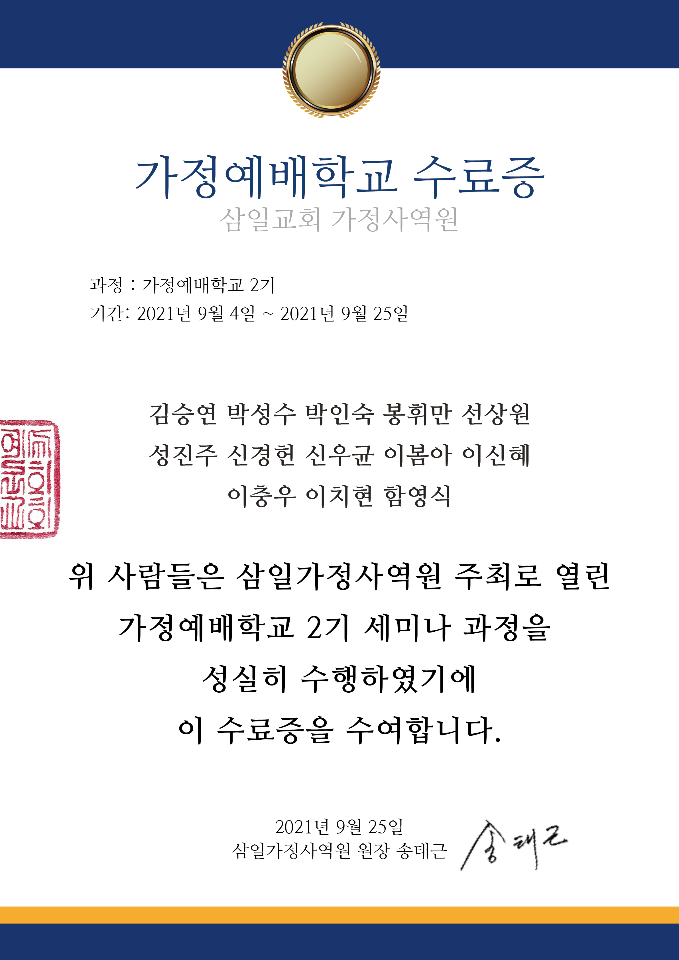 가정예배 세미나 잘 마쳤습니다. 수료자와 수료증 업로드합니다~