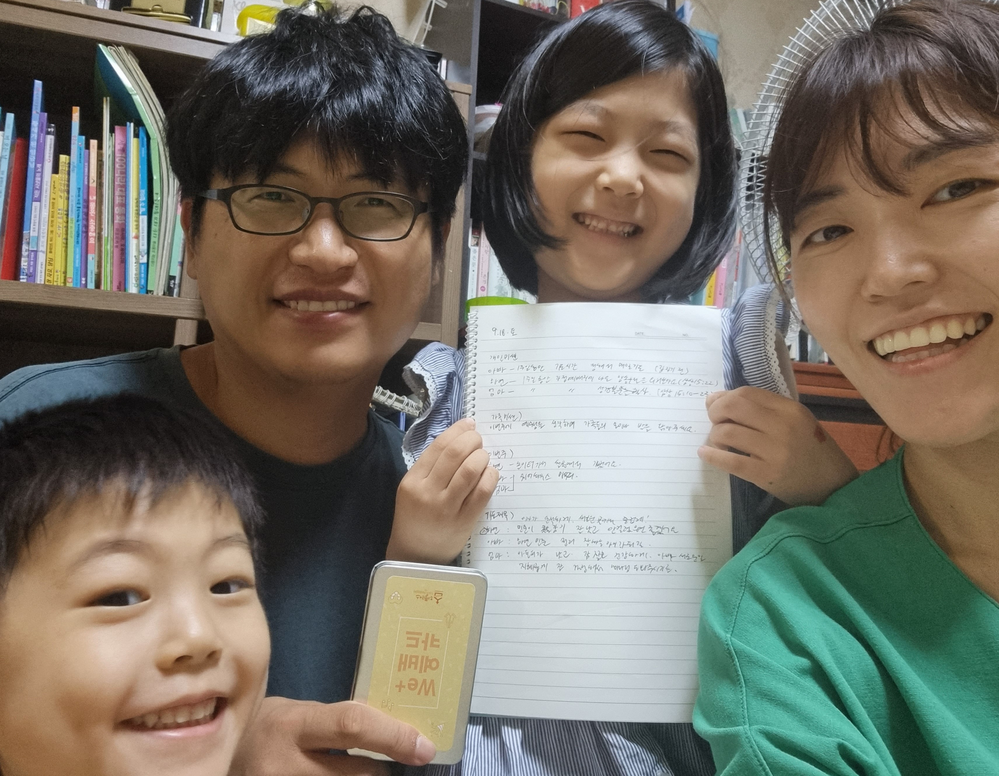 9월 2주차 가정예배 사진입니다. 장년 1진(이석우, 주재영, 이하윤, 이제윤)